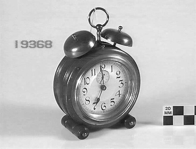 Round wooden case on horizontal cylindrical legs. Brass ring on top has a bell on either side. Spring wound.
