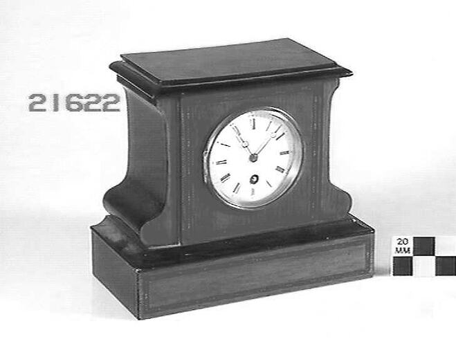 Wooden case, brown front and black sides and top. White enamel dial has black roman numerals and a gold rim. Marquetry surrounds the dial and is set in the base. Key inside clock. Spring wound; anchor escapement