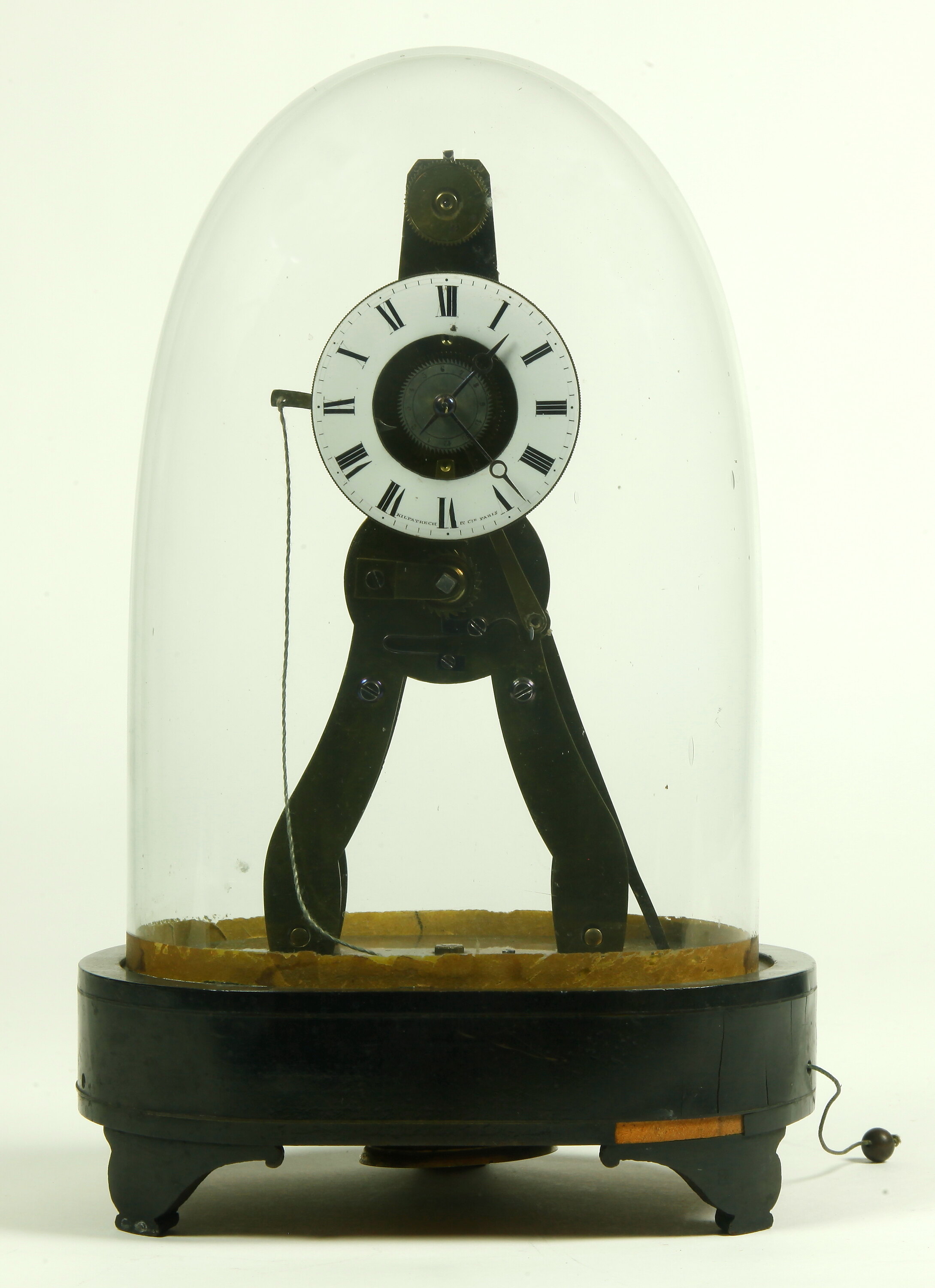 Clock mounted on brass frame shaped like an 'A' on black wooden base, with glass dome. Dial has white chapter ring and black Roman numerals. Pendulum is suspended on cord loop controlled by windlass. Arabic numerals for alarm but 10 and 11 are displaced. Spring wound; anchor escapement.