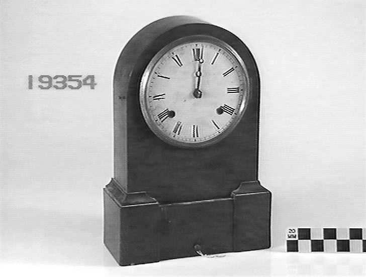 Round dial in wooden case with curved arch. Movement is attached to back panel. Count wheel strikes on a coil gong. Spring wound; anchor escapement.
