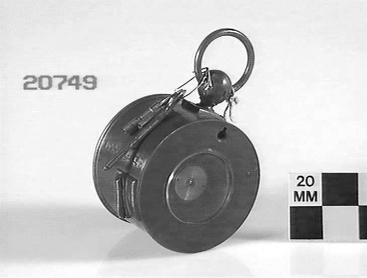 Consists of a brass cylinder with circular glass aperture. Dial has arabic numerals. Clock has 3 keys. 3 are handmade and the third is cast and of a later date. Spring wound.