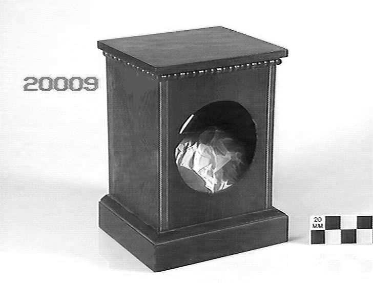 Rectangular wooden case with vertical inlay strips at edges, and glass door at back. Round white dial with brass bezel. Spring wound; D pallet escapement.