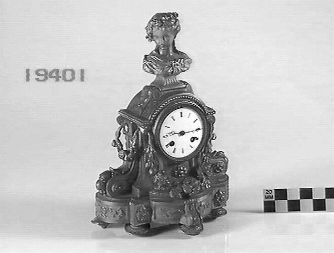 Ormulu case with floral garlands, surmounted by woman's portrait bust. Locking plate striking mechanism. White enamel dial. Spring wound.