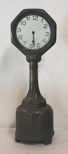 Consists of hands on an arbor between two round glass plates in octagonal metal frame. The hands are rotated by rings attached to ends. Movement in base. Clock face supported on column. Spring wound; dead beat pin pallet escapement.