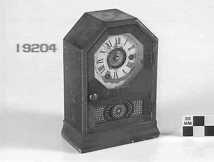 Wooden case with truncated gable and octagonal glass in front of dial. Rectangular glass with transfer in lower part of door. The dial is white enamel on metal, with central hole for brass alarm dial. Spring wound; anchor escapement.