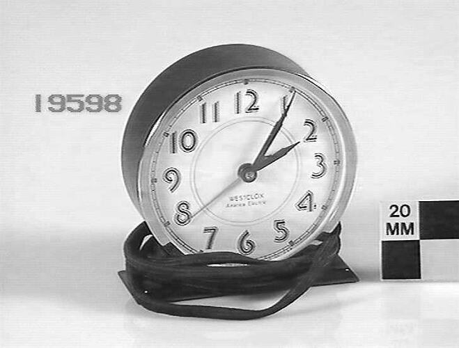 Alarm clock with round black metal case on flat metal stand. White cardboard dial with red dots to mark hours. Two black hands, and gilt sweep seconds hand. Electric synchronous motor.