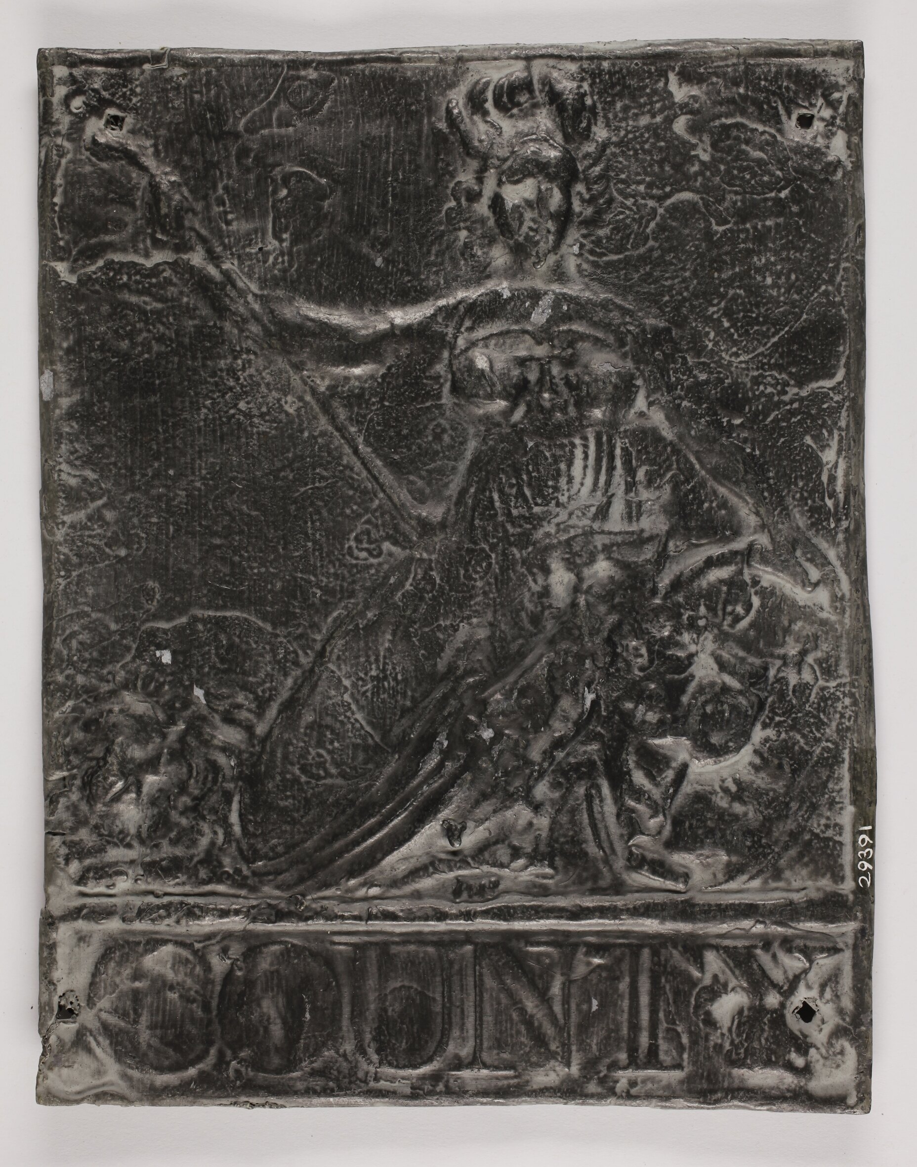 Cast lead, rectangular shaped plaque with image of woman holding a spear and shield in front of a lion.