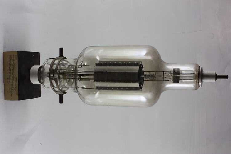 Cylindrical glass bulb with necks at each end, standing on display board. Grid connection at top of bulb. Top and bottom connections are ceramic. Anode is connected via a metal ring clamped around bottom of lower neck. Asbestos pads distribute pressure of clamp. Filament is connected by two pins on base.