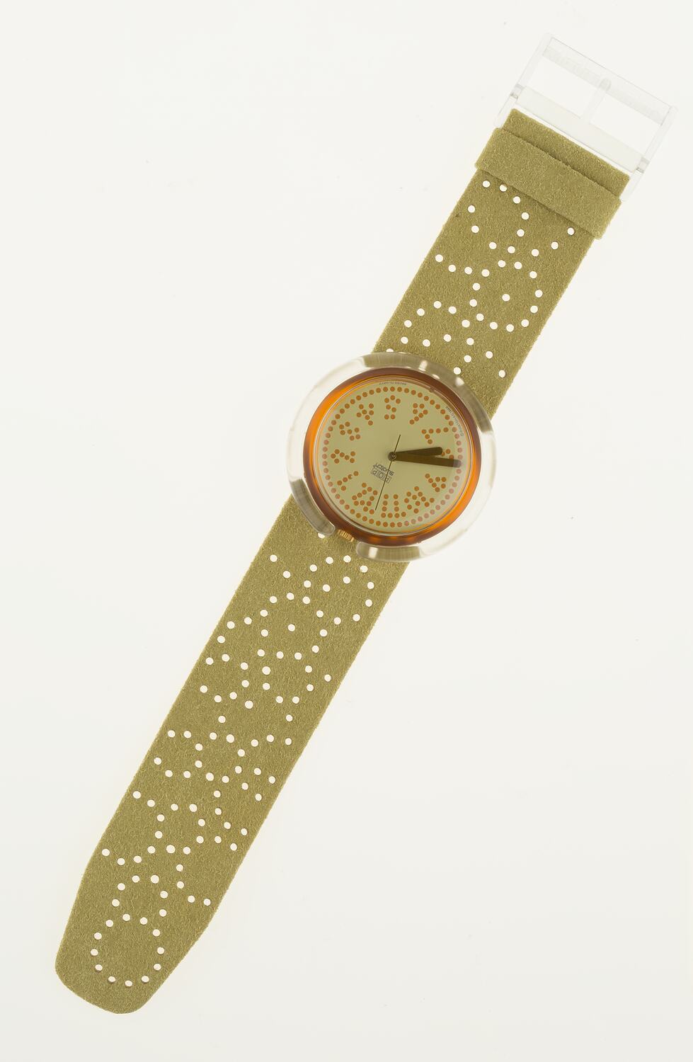Quartz wrist watch, 'Epice', PWR 108, Swatch SA, Switzerland, 1994. On eof Pop Swatch range. Clear acrylic case, face and punched leather strap mustard colour.
