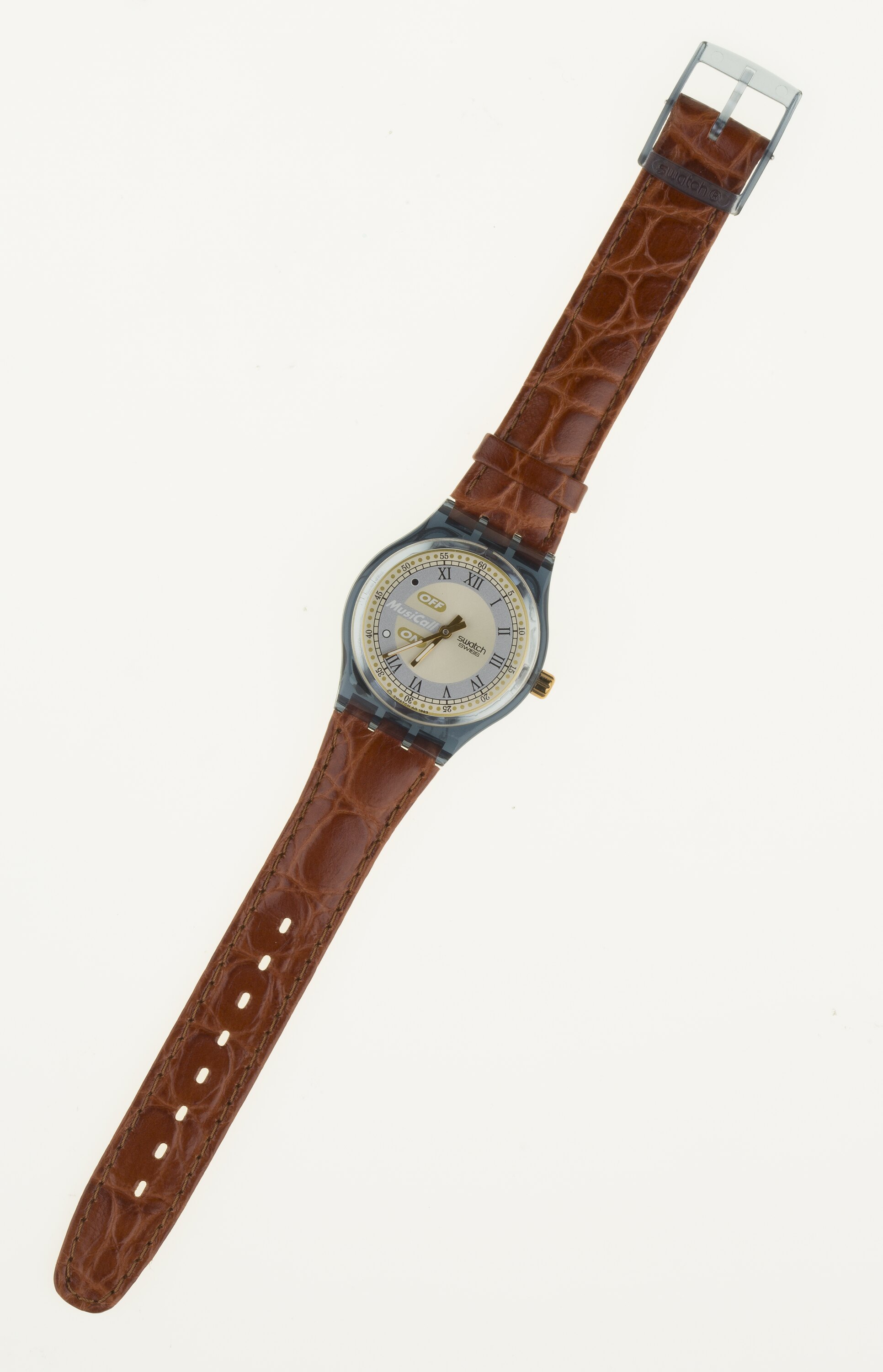Quartz wrist watch, 'Sax', SLM 102, Swatch SA, Switzerland, 1994. Black acrylic case with gold & grey face and brown leather strap.
