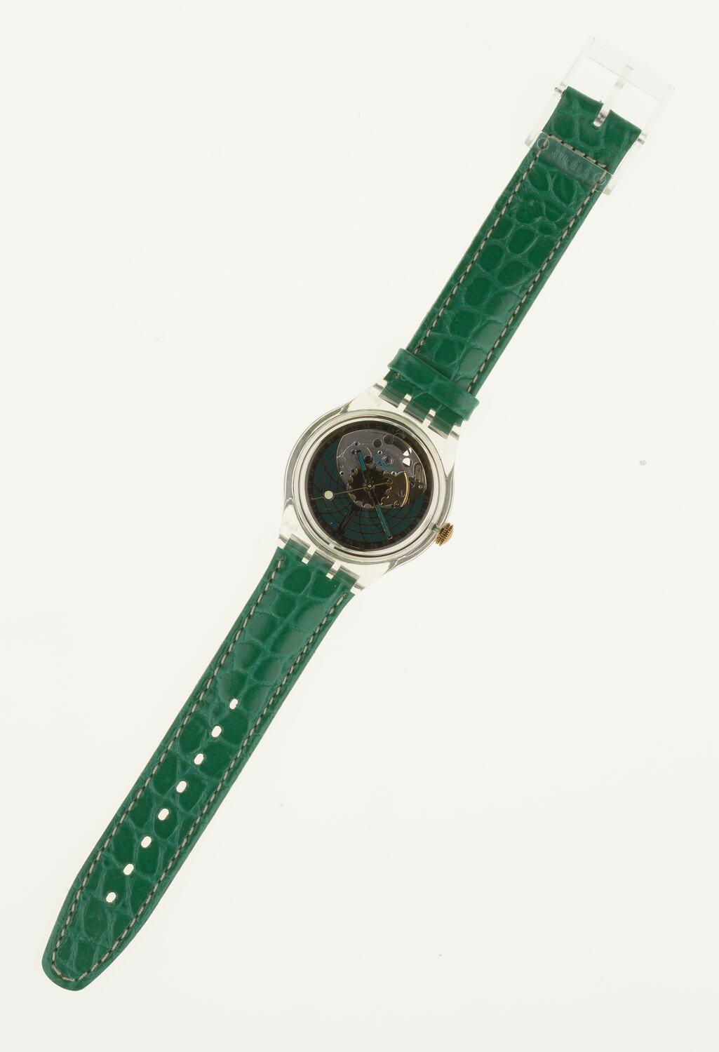 Quartz wrist watch, 'Ramarro', SAK 111, Swatch SA, Switzerland, 1994. Clear acrylic case with gilt & green face, and green leather strap.
