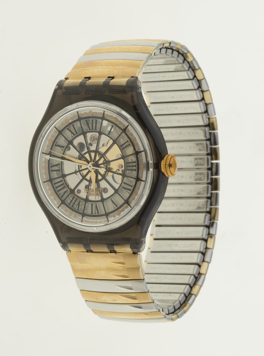 Quartz wrist watch, 'Marechal', SAM 101, Swatch SA, Switzerland, 1994. Black acrylic case, black & silver face, gilt flexible metal band.