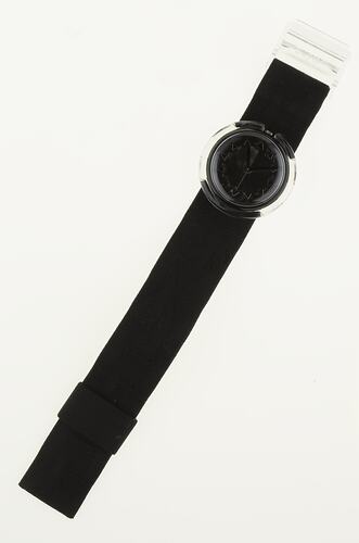 Clear acrylic case, silver face with black hands and triangles for numerals, black elastic strap. In plastic box with warranty & instructions. Quartz movement.