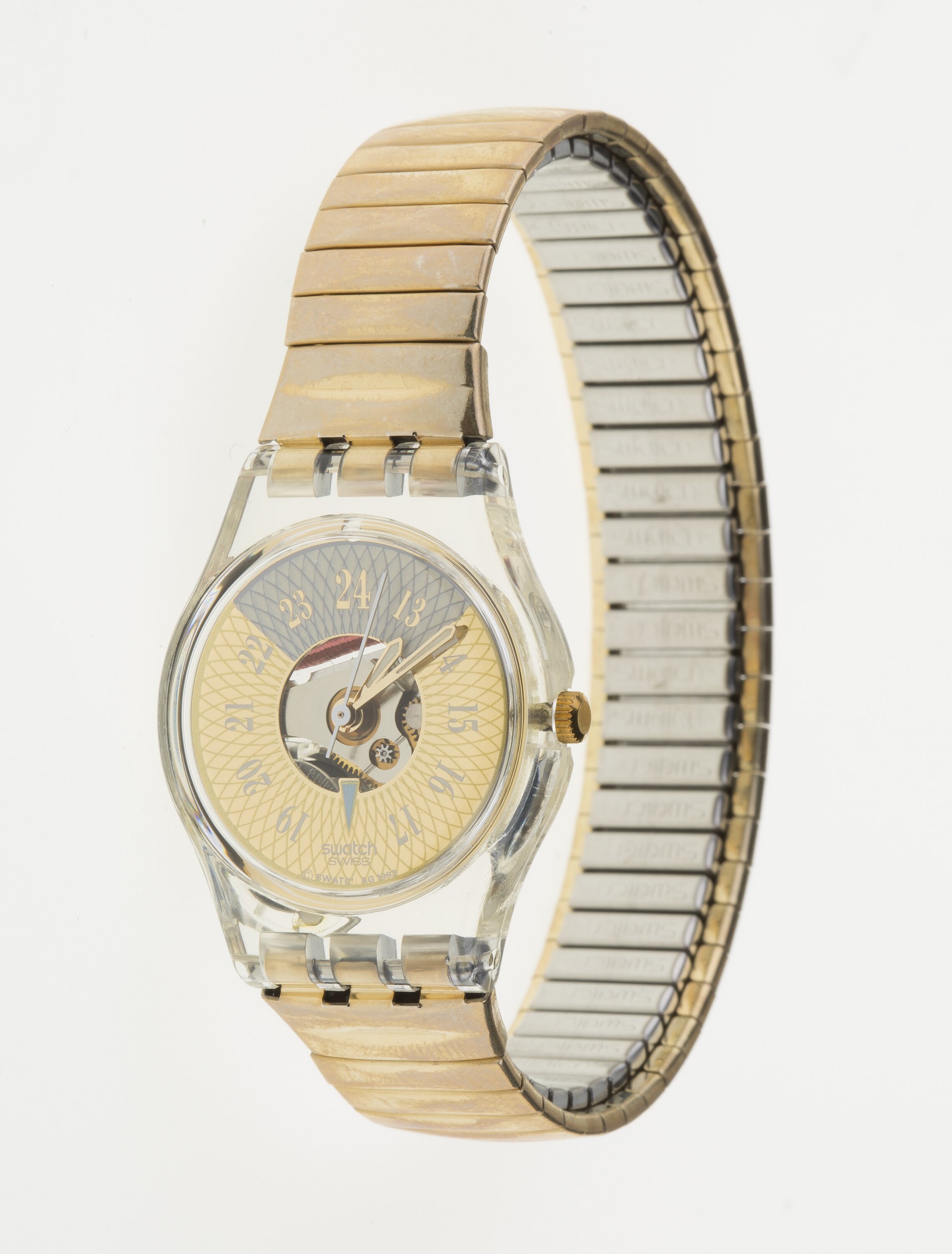 Ladies quartz wrist watch, 'Cunegonde', LK 149, Swatch SA, Switzerland, 1994. Clear acrylic case with gilt flexible metal band, face patterned with hours 13 to 24.