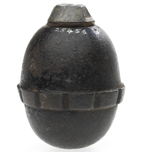 Egg hand grenade, comprising egg-shaped cast iron body with segmented ring around middle & screw- in plug at top end, removed to allow insertion of igniter assembly.
