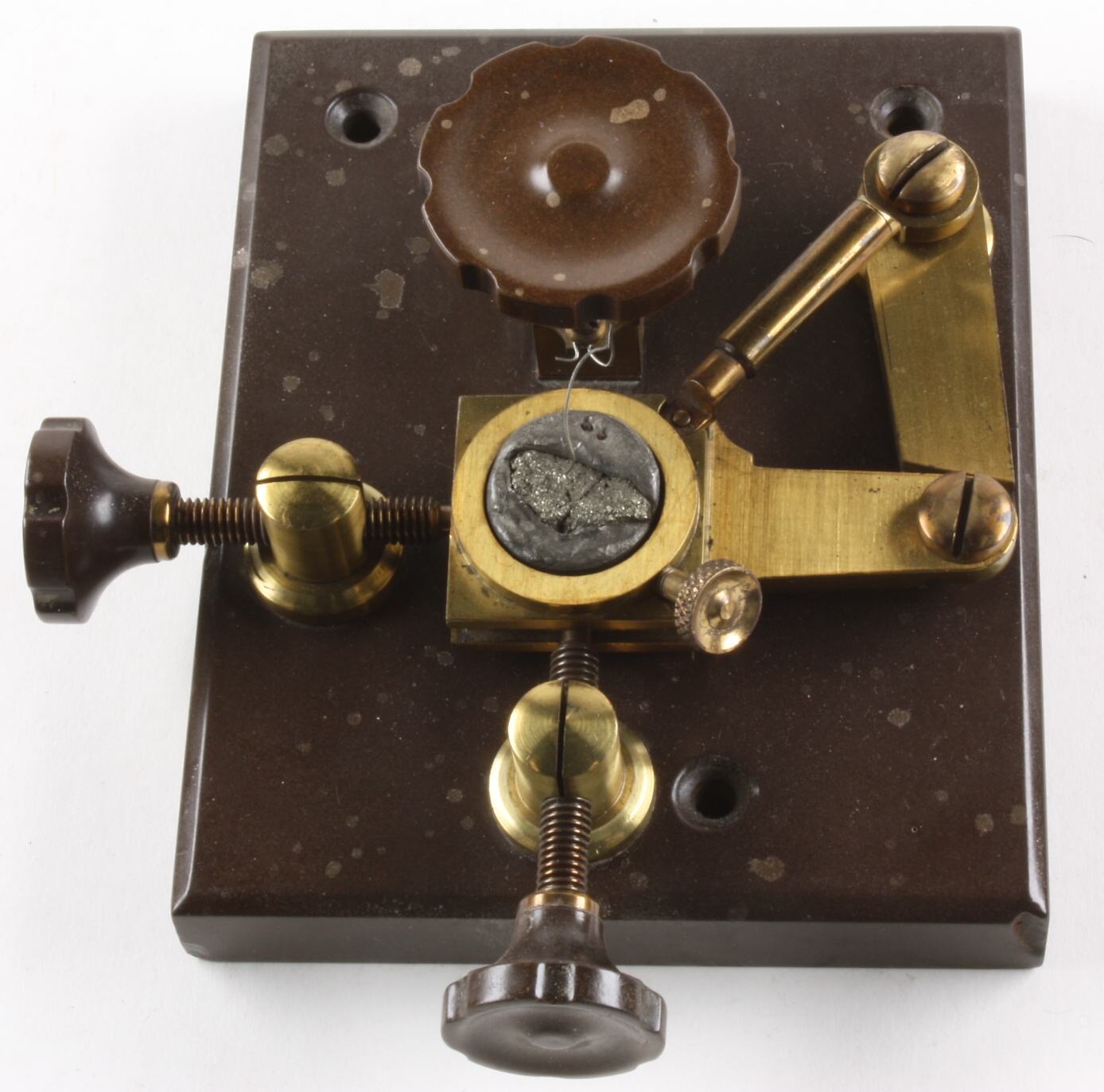 Crystal detector, used in early crystal set radios. Designed by J. G. Balsillie, and made at the Shaw Works, Randwick, Sydney, Australia in 1913. The pyrite crystal in the holder was presented separately in 1925.