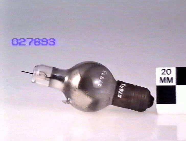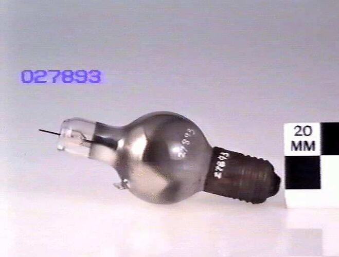 Spherical bulb with extension on top with Edison screw base and top anode connection. There is an asbestos filling where the anode top connector is recessed.