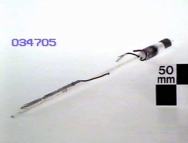 Brewster windows at each end. Filament starter in side tube. Three current- limiting resistors in side- tube and in electrode circuit. Serial number 3314-803 403-2070.