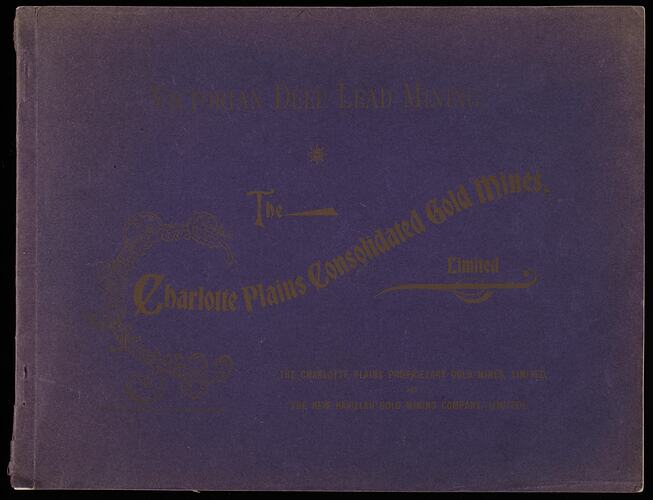 Book including description and black & white photographs of the Charlotte Plains Gold Mine. Printed by Weston & Edwards, Maryborough, Victoria, with a foreword dated February 1902.