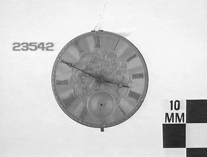 Gold coloured metal dial has foliage design and gold roman numerals. Seconds dial at 6. Has scale fast to slow. Stem wound. Spring; lever escapement. Fusee and chain.