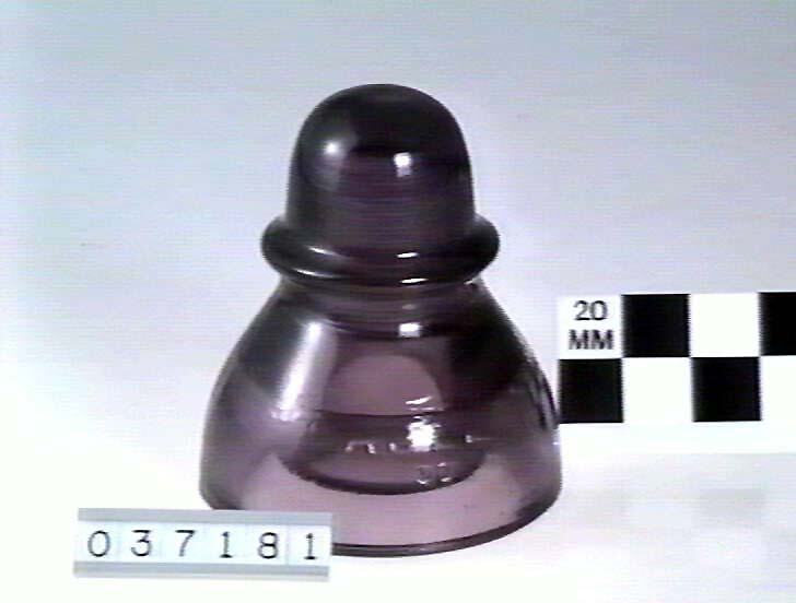 Glass telegraph line insulator of double umbrella shape. Glass is coloured purple.