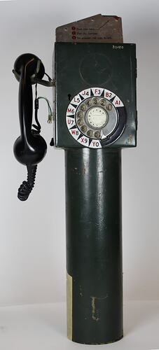 A coin-operated telephone typically used in public telephone boxes in Australia. This style of telephone, with single handset (with microphone and receiver) and an alphanumeric dial, was introduced from 1955 after a period of trials at the General Post Office in Melbourne. It has been adapted from an earlier configuration that used a carbon microphone in the casing above the dial, which is now blanked off. It originally used pennies but has been later upgraded to use 10 cent coins, after decimal currency was introduced in 1966. Public telephones were often subjected to vandalism and this type had been supreceded by the early 1980s.