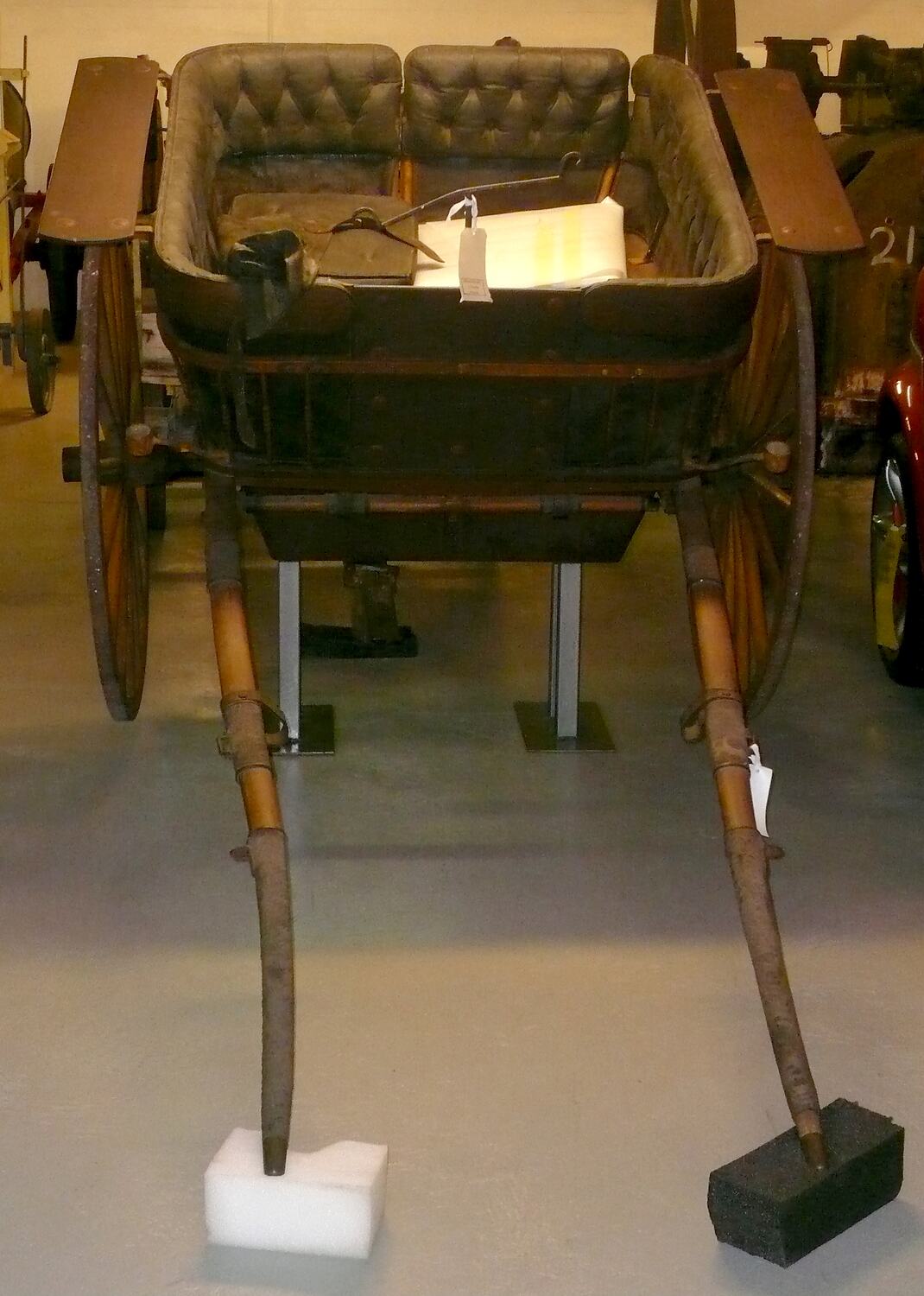 Two-wheeled light horse-drawn vehicle design for private use pulled by a single medium-sized horse or pony. Fitted with a high-sided square-shaped or tub-like body having rounded corners, varnished timber frame and distinctive turned spindles or 'stick work' uprights all round between the top and middle rails. The top rail consists of a wide board with steam-bent corners supporting a deep padded all round squab with zigzag button patterned upholstery in deep blue-black leather. Loose seat cushions in matching upholstery are provided for the inward-facing L-shaped bench seat across the front and right-side. A hinged rear access door is provided in the left-hand or near-side corner, with a brass T-shaped latch handle and single forged iron access step fixed just below the maker's plate. The body is fitted with straight horizontal mudguards mounted on each side top rail, lamp brackets on each front corner, chrome-plated front T-stand for supporting the reins and a whip holder attached to the rear right-hand or off-side corner adjacent to where the driver sat. The body is mounted on three-leaf double elliptical side springs over a square section "cranked" or "drop centre" axle with un-dished 16-spoke "spider" wheels constructed with Savern's patent hubs, hickory spokes and half-rims and iron tyres with counter-sunk rim bolts. The lightweight slightly bent shafts have leather jacketed ends and hind quarter patches which would have originally had a highly polished or glossy finish but are now heavily crazed. All timber work has a clear varnished or stained and varnished finish, while the hubs and undercarriage ironwork, including springs and axle, are painted in black with deep red linework.