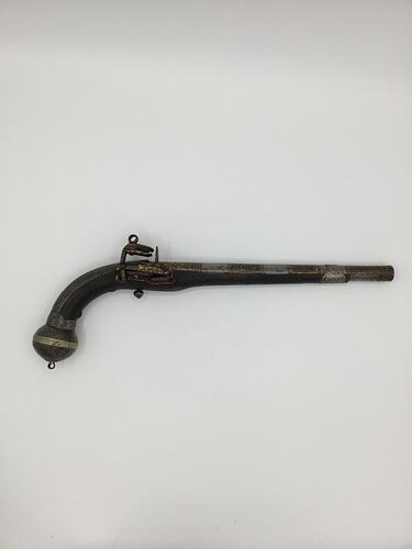 An article published by The Argus in 1929 (5 January, p.3) includes a description of the pistol in the context of donor William Cole's wider collection: 'A very rare specimen is a Circassian pistol, with ball butt and ball trigger. All the lockwork is outside the pistol. The wood of the butt is covered with finely grained leather, and the metalwork is inlaid with gold and silver.' The article does not identify how Cole came to own the pistol. Born in 1864, he began collecting firearms as a boy.
