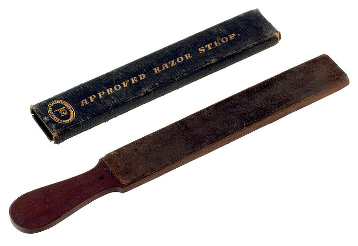 Razor strop comprising cedar board covered with fine and coarse leather. Made by Christopher Johnson & Co., Sheffield.