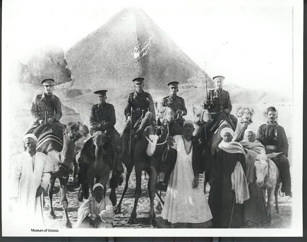 Group of five officers of the1st AIF on camels in front of a pyramid. Dated 1915. Egyptian camel drivers are in the foreground. Lieutenant Frederick G. Wilson is the second soldier from the right.