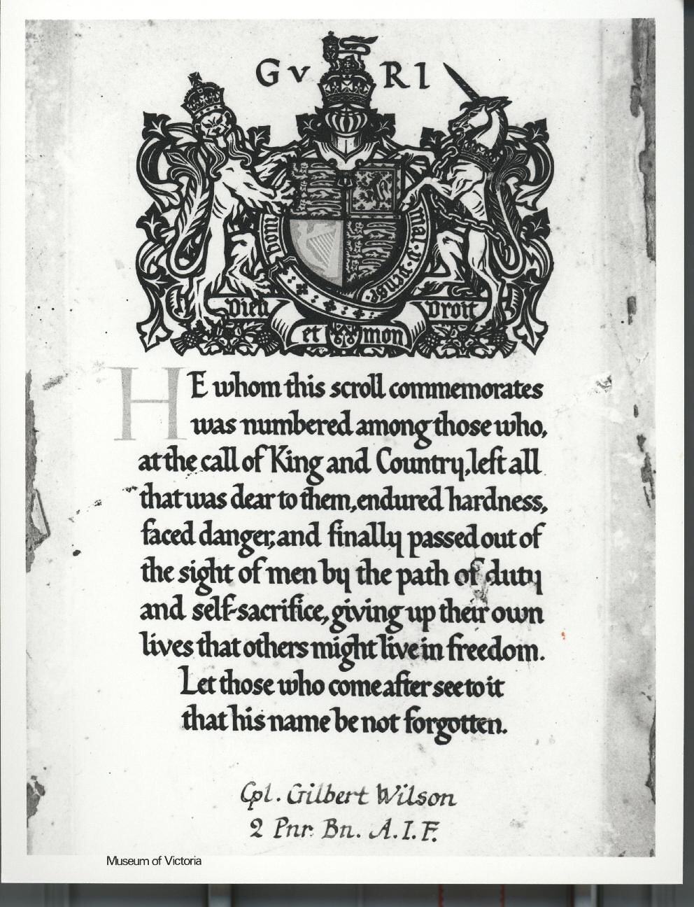 'He whom this scroll commemorates was numbered among those who, at the call of King and Country, left all that was dear to them, endured hardness, faced danger, and finally passed out of the sight of men by the path of duty and self-sacrifice, giving up their own lives so that others might live in freedom. Let those who come after see to it that his name be not forgotten.' The name 'Cpl. Gilbert Wilson/ 2 Pnr. Bn, A.I.F.' is hand-written in red ink at the bottom of the document.