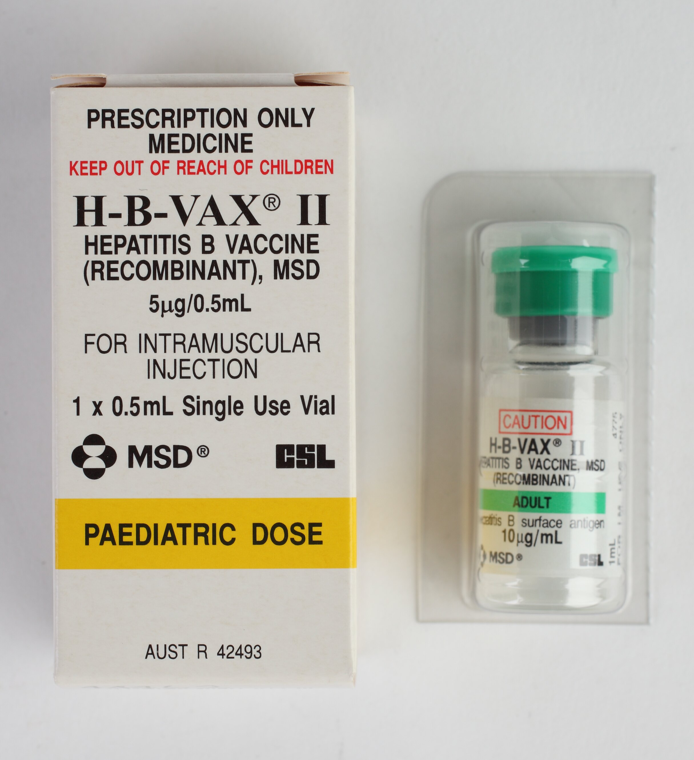 Pharmaceutical packet containing one x 0.5ml single use vial of H-B-Vax II, hepatitis B vaccine (recombinant), MSD. For intramuscular injection. Paediatric dose. Manufactured by CSL, Ltd.