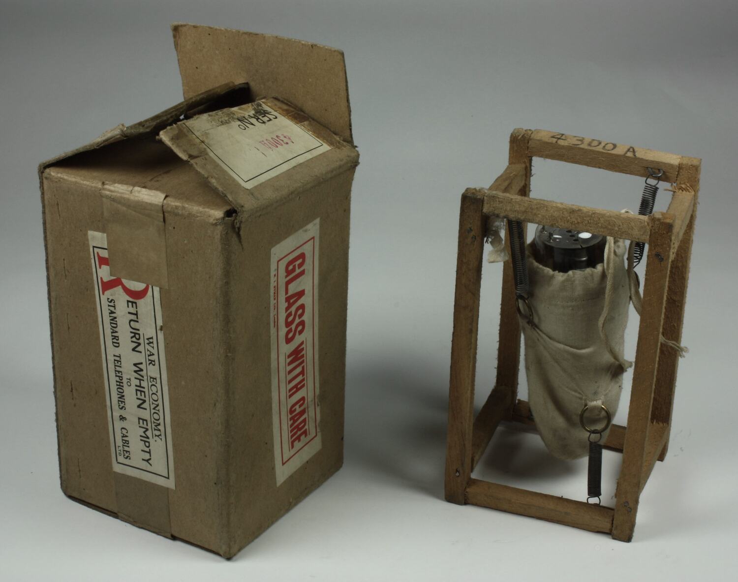 On bulb: STC (logo)/4300A/F/(broad arrow). Part 1: On bulb: STC (logo)/4300A/F On pinch: PK 65 On one side of box: GLASS WITH CARE On adjacent side of box: WAR ECONOMY/RETURN WHEN EMPTY/TO/STANDARD TELEPHONES & CABLES LTD. On one end flap of box: 4300A/SER No (nothing visible) On other (closed) end of box: 4300A/F/G P O (faint) On wooden frame: 4300A Part 2: On pinch: PL(could be C) 10 On one side of box: GLASS WITH CARE On one end flap of box: 4300A/SER No (nothing visible) On other (closed) end of box: 4300A/F On wooden frame: 4300A