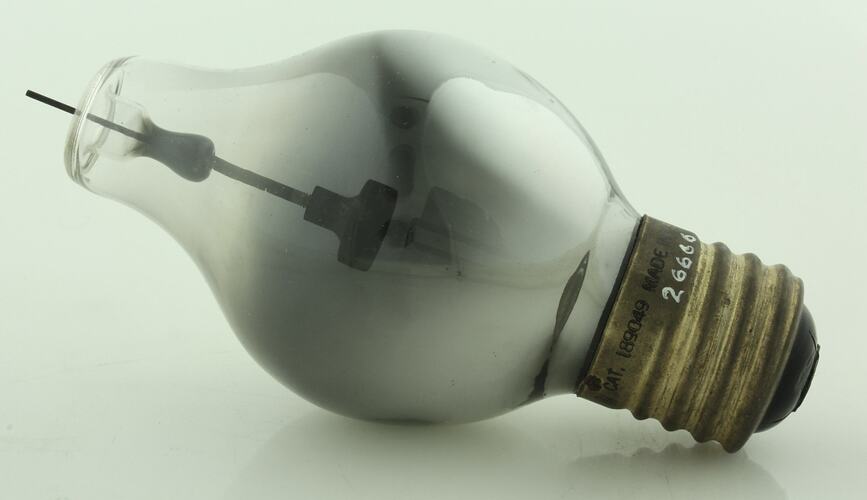 On brass base: TUNGAR BULB (GE logo) CAT. 189049 MADE IN U.S.A. SC Paper label on end of box: Tungar BULB/ CAT./189049/ 6 Amperes/ GENERAL ELECTRIC CO./MADE IN U.S.A./NP-23260-A Continuation of paper label on side of box: GENERAL ELECTRIC CO./MADE IN U.S.A./ Faint acceptance stamp: PASSED/PMG ?/?/MELB On opposite side of box: Paper label with handwritten summary of the use of the bulb and some data.
