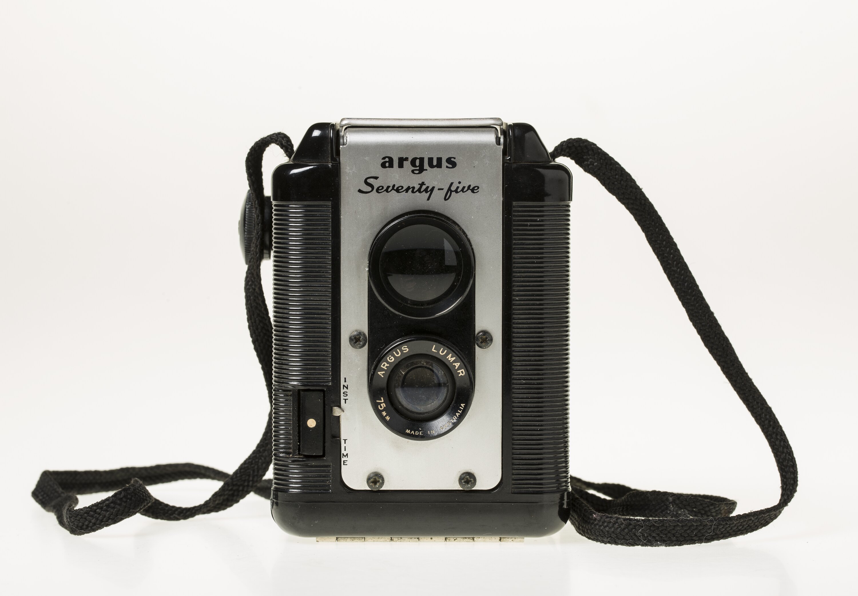 The company sold nearly three million cameras of this model, which was nicknamed 'the brick'. It was a pseudo TLR in that, strictly speaking, it did not function as a twin lens reflex camera. It has a 75mm Lumar, single meniscus element lens, in front of a fixed aperture of f/11. There are two exposure settings: 'Inst' (instant) and 'Time'.