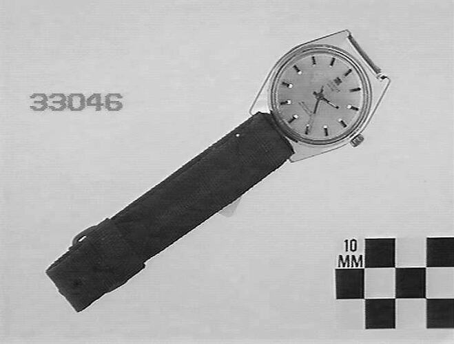 Brass case plated with nickel and with stainless steel back. Silvered dial has silvered hands and centre sweep seconds hand. Silvered metal markers for hours and is marked with a 'T' in raised square. Clear plastic back plate. Spring wound; lever escapement. Plastic disposable movement; main train of white plastic, escapement of blue plastic.
