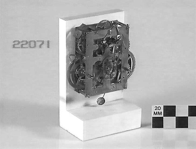 Striking clock movement mounted on a white wooden display stand. Made in United States of America.