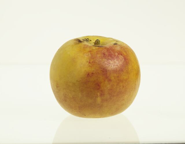 Wax model of a small apple with a short stem, painted yellow and orange.