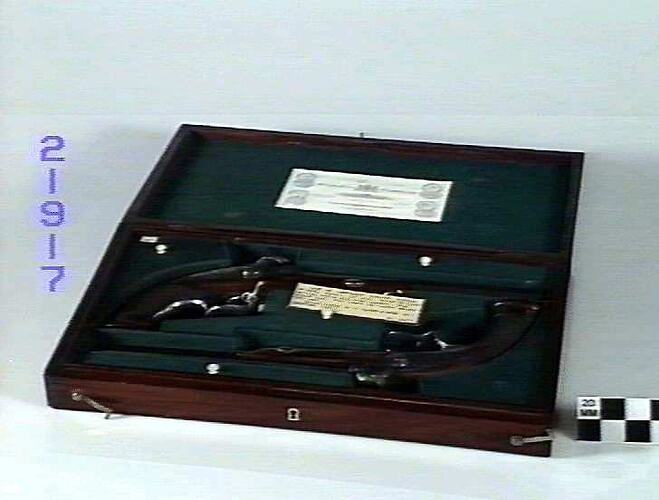 Muzzle loading, rifled (8 grooves), octagonal twist steel barrel 248 mm. long, adjustable v notch backsight, nickel silver blade foresight overall length 393 mm., side lock (back action) & hammer, spur trigger guard, set trigger. Wooden stock extends halfway along barrel, flat steel butt cap, oval silver monogram plate on L. H. side. Mounts engraved with foliate scrolls. Fitted wooden case lined with green baize. Accessories, brass powder measure, key for sight.