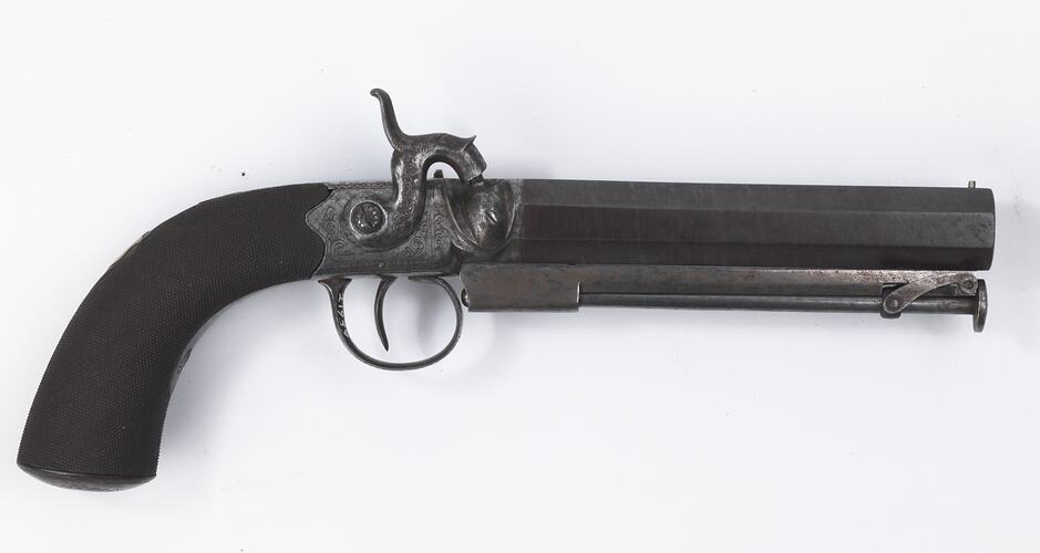 Muzzle loading, smooth bore, octagonal barrel 6 in. (152 mm.) long, V notch backsight, bead foresight, overall length 10 5/8 in. (270 mm.) Box lock with side hammer, oval steel trigger guard. Finely chequered grip, steel butt cap with cap recess, shield shaped silver monogram plate, swivel ramrod carried in grooved rib under the barrel, belt hook screwed to L.H. side of lock. Mounts engraved with foliate scrolls. Fitted wooden case lined with green baize, accessories, powder flask, bullet mould, two cleaning rods.