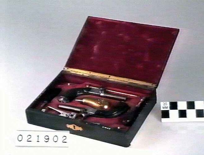 Screw off, rifled (16 grooves), damascus twist barrel 58 mm. long, overall length 164 mm. Box lock with hammer off centre to the right & folding trigger. Wooden stock carved with leaf pattern & blackened, ornamental steel butt cap. Barrel browned, lock box of bright steel engraved with foliate scrolls. Wooden case covered with imitation leather is fitted & lined with maroon baize. Accessories in case. Include, embossed powder flask, bullet mould, screw driver, nipple wrench, cleaning rod & small wire brush.