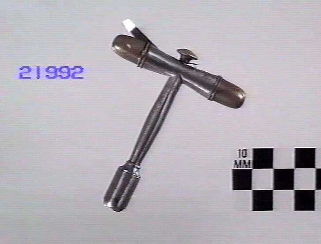 Nipple key & pricker combined. Steel 'T' shaped body with brass cap recesses screwing onto ends of handle & pricker with threaded brass cap screwing into apex of 'T'.