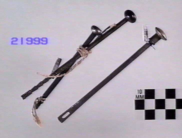 Cleaning rods, for pistol barrels, one brass with horn knob (13.60cm), one steel (10.00cm) and one steel with brass knob (13.30cm), three examples.