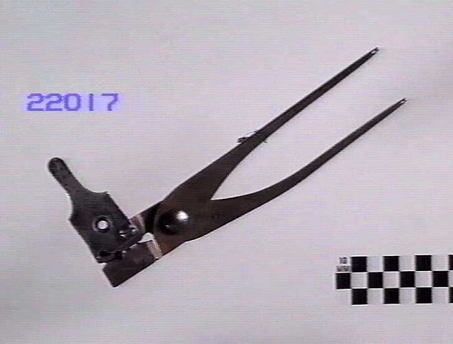 Bronze bullet mould, casts one conical bullet, .437 x 3.30 cm long, with rounded base, hinged on top steel neck cutter.