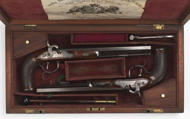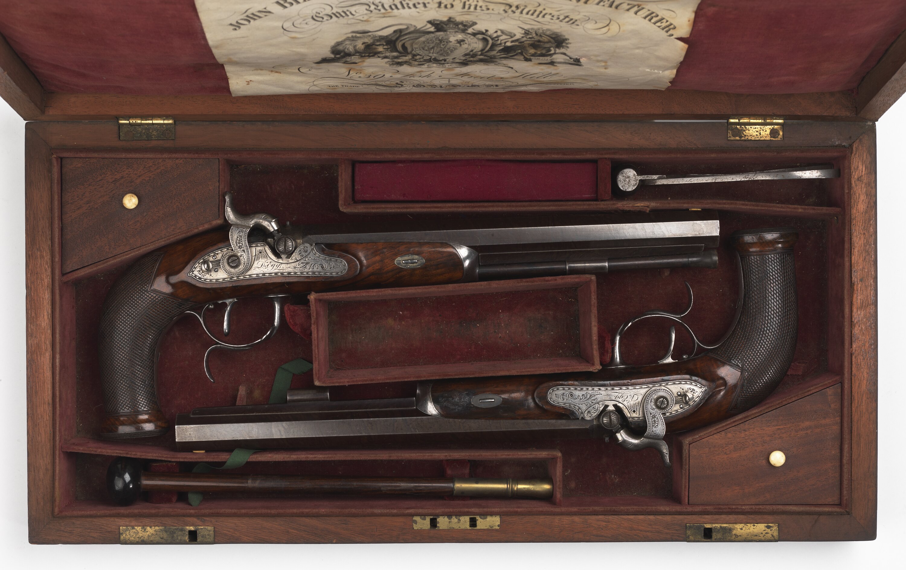 Floral ensemble engraved tang and engraved border motif and double gold bands inlaid at breech end of barrel, notched rear sight, gold blade front sight. Lock plate engraved with loose foliate scroll and engraved 'D. Egg', hammer head engraved with typical 'open-mouthed fish' features, and hammer arm engraved with foliate scroll and attractive border motifs, safety catch at hammer rear, hair triggers, steelforewood cap with engraved starburst motif, oval steel triggerguard with spur and pineapple forward extension, plain rear extension, and flat buttcap with engraved border motif. Wooden, probably mahogany, case lined in burgundy velvet with seven major compartments holding a bullet mould and rammer. John Blanch, Fish Street, London, trade label on lid inner reads in part 'JOHN BLANCH, GUN & PISTOL MANUFACTURER'. Case corners reinforced with brass corner mounts and brass handle in lid center framed by double-point rectangular brass escutcheon.