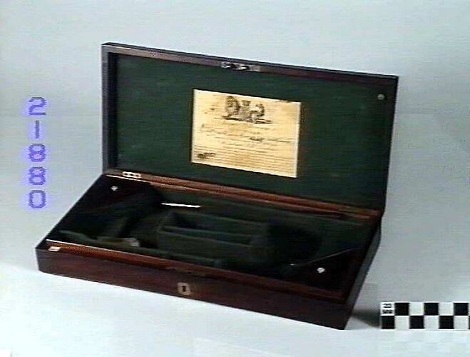 Octagonal smooth bore barrel, twist steel. Barrel length. 238 mm. Gold breech band, platinum vent plug, side hammer with safety bolt, hair trigger. Oval trigger guard with spun and engraved pineapple extension v. notch rear sight set on tang, pin head foresight let into the barrel. Engraved mounts, wooden ramrod. Walnut stock with fish tail butt, finely chequered grip. Cased with accessories, including pouch, cloth, nipple key, tin of caps, ramrod.