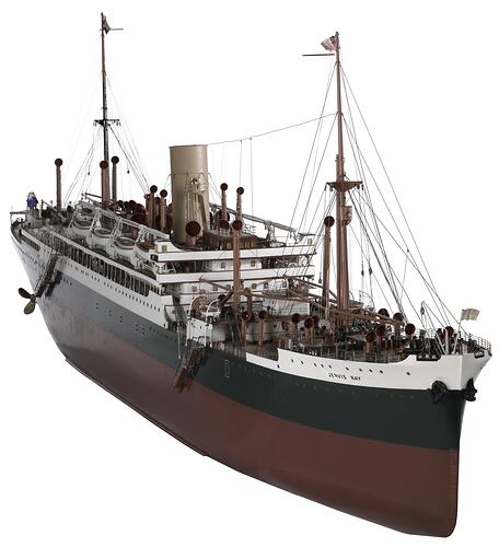 This 1:48 scale model of the S.S. Jervis Bay was donated to the Museum by the Aberdeen & Commonwealth Shipping Line in 1955. It was originally built as a model of the 'Moreton Bay' but was modified subsequently by the Museum to represent the 'Jervis Bay'.
