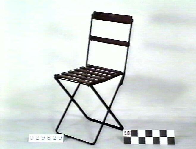 Folding chair claimed by donor to have come from Cobb & Co.'s, change house in Heidelberg, Victoria. The chair has a wrought iron frame hinged for folding. The seat & back rest are made of wooded slats.