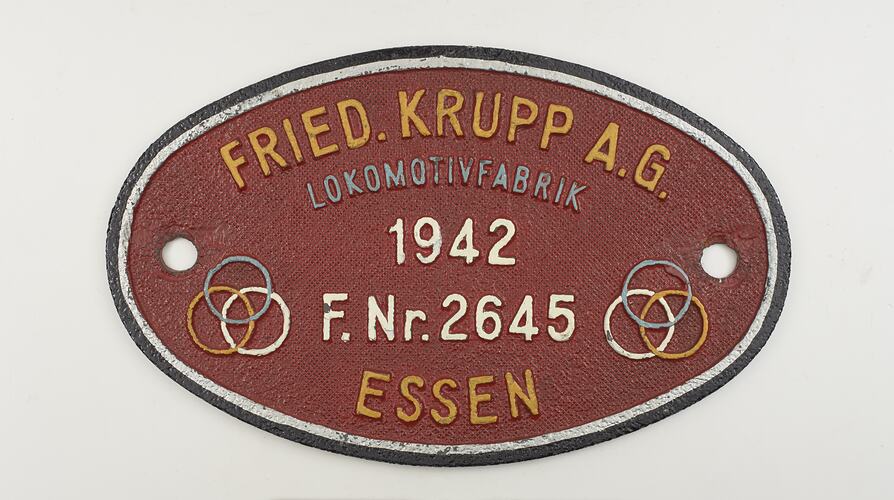 White metal oval locomotive builders plate, F. NR. 2645, manufactured by Friedrich Krupp AG, Essen, Germany in 1942.