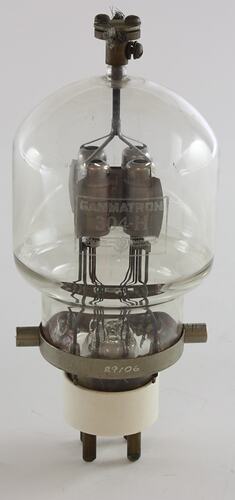 Cylindrical glass bulb with a large 4 pin ceramic base, a metal ring around the bottom of the bulb carrying two grid connections and an anode pin at the top which still has its connector attached.